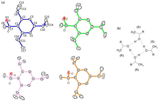 1-(2,4,6-Triisopropylphenyl)ethanol crystallizes in the triclinic system in the P Space Group. Four of the eight molecules in the unit cell are independent. There are four independent molecules of this compound in the unit cell (Figure 7a). The numbering scheme is shown on the first molecule. The bonds of the carbon atoms of the benzene ring with the carbon atoms of the isopropyl groups in 1-(2,4,6-triisopropylphenyl)ethanol are 1.51–1.53 Ǻ. The angles C(1)-C(2)-C(9) and C(1)-C(6)-C(11) in the molecules are all larger than 120° by 2–4°, whereas the angle C (3)-C(4)-C(10) is 121–123°. The C(9) and C(11) atoms of the B molecule of 1-(2,4,6-triisopropylphenyl)ethanol lie in the plane of the aromatic ring of this molecule. In molecule A, the C(10) atom lies in the plane of the aromatic ring. In molecules A, B and C, atoms C(9), C(10) and C(11) lean out from the plane containing atoms C(1), C(2), C(3), C(4), C(5) and C(6) by a maximum of 0.057 Ǻ. In molecule D, these atoms deflect by 0.1 to 0.2 Ǻ from the plane of the aromatic ring. The values of the torsion angles C(5)-C(6)-C(11)-C(16) and C(5)-C(6)-C(11)-C(17) are the same in molecules A and B. They are −96° and 28°, respectively. The values of these angles in the other two molecules of this alcohol are similar, and in these molecules, they are, respectively, −60° and 64°. All four independent molecules of 1-(2,4,6-triisopropylphenyl)ethanol engage in strong O-H…O hydrogen bonds, which leads to the formation of tetramers. This is significantly different than in the case of the alcohol with methyl substituents. The bulkier substituents lead to having fewer molecules in the assembly. The diagram of the resulting tetramer is shown in Figure 7b. It can be seen that the centrosymmetric tetramers exhibit an S-S-R-R configuration.