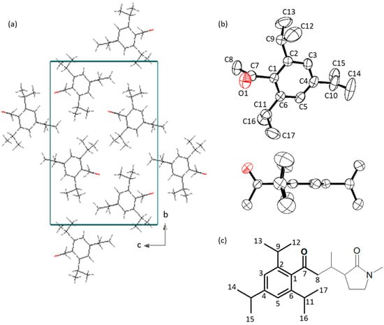 The molecular crystals of 1-(2,4,6-triisopropylphenyl)ethanone were grown independently by us and by Blair et al. [50]. Apart from the fact that in the latter study, the refined structure was modeled with disorder in two isopropyl groups, whereas our molecule was modeled with disorder only in the substituent in the para position, the most important parameters and values are very similar. Our studies have shown that unlike the molecules of acetophenone (ACETPH), those of the studied ketone do not form any hydrogen-bonded networks via a C-H…O type bond. The arrangement of the molecules in both our crystal (Figure 10a) and that obtained by Blair et al. [50] is very similar. These parameters were compared with those for acetophenone, which has the same arrangement of atoms except for the lack of substituents in the benzene ring, as well as one more compound from CSD in which there are isopropyl groups in both ortho positions and in the para position relative to the carbonyl group: (3RS,1′RS)-1-methyl-3(1′-methyl-3′-oxo-3′-(2,4,6-triisopropylphenyl)propyl)-2-pyrrolidinone (KECDIF [52]). The numbering of carbon atoms is shown in Figure 10b,c. Selected bond lengths, angles and torsion angles of 1-(2,4,6-triisopropylphenyl)ethanone and the appropriate fragments of KECDIF and acetophenone are listed in Table 1. Changes in geometric parameters resulting from the presence of a bulky group at the C(7) atom instead of a methyl group were determined by comparing the parameters in the molecules of 1-(2,4,6-triisopropylphenyl)ethanone with the appropriate parameters in molecules of KECDIF.