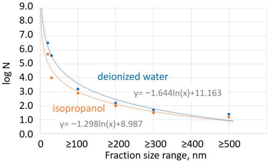 | Fraction Size, nm | Cumulative Particle Concentration, Number N of Particles in 1 mL | Counter | |||