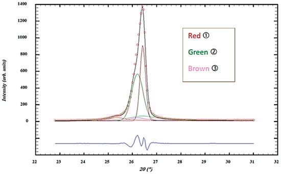 Commercial sample, GR. Possible decomposition of an XRD peak into five components: ➀, ➁, and ➂ peaks. Both intense ➁ and ➂ peaks are Gaussian in shape. I (observed) in black with red spots, I (calculated) for three peaks labelled (1) in red, (2) in green, and (3) in brown, and in blue is the difference between I (observed) and I (calculated).