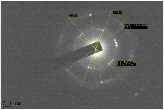 After an ultrasound treatment of 6 min with pulses of 15 s and stops of 15 s, the nanoscrolls are no longer detected neither by microscopy nor by XRD. The fact that nanoscrolls can be transformed in flat domains was already known, with bubbles of cavitation being inserted within the main part of the scrolls and destroying them []. The present work complements previous studies by showing that the size of the flat nanoparticles is directly affected by the time of the applied ultrasound. Micrometer-sized particles observed after 6 min of ultrasound and drying are replaced by smaller particles of size lower than 100 nm after an ultrasound treatment of 2 h. An additional selected electron diffraction is presented in Figure 3 and was carried out on a graphene particle. This image is important, as it establishes that the studied specific sheet contains five distinct layers. The white spots are indeed grouped in thirds on the Bragg rings, but the medium spot is larger than the two other ones.