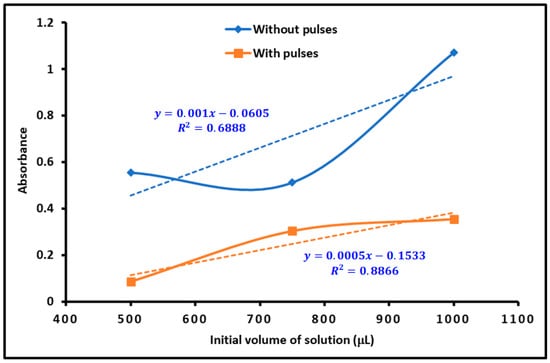 We present in Figure 5 the absorbance that can be measured after mixing several volumes, 1000, 750, and 500 μL, of the activated isolated solution immediately after ultrasound and centrifugation at 5000 rpm for 12 min with and without pulses. Dilution by absolute ethanol was carried out to obtain 4 mL of solution in each case (with 3 mL, 3.25 mL, and 3.5 mL, necessary to obtain an overall volume of 4 mL), and absorbance was measured on a quasi-flat straight line observed between 700 and 800 nm.