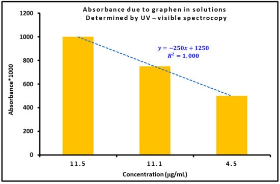 The measured absorbance was used to estimate the concentration of graphene sheets in suspension. We used the Beer–Lambert relation, A = ε c l, and a cell with an optical path of l = 1 cm. The absorbance, A, has no units. C is the graphene concentration and ε the absorption coefficient in L·mol−1·cm−1.