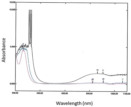 Furthermore, on the left side of the spectrum, still with a concentrated solution, multiple and very intense peaks were detected between 309 and 371 nm (4.01 to 3.81 eV) with a second non-resolved broad peak between 262 and 371 nm. With progressive dilution, the narrow and intense peaks were eliminated, and the first peak was decomposed into at least three peaks, one at 230 nm and two above 250 nm. Further dilution shifted the broad peak to 265 nm, a position indicative of thin reduced graphene and attributed to the π-π* electronic transition, confirming the absence of graphene oxide (GO) in our diluted samples. For oxidized samples, a peak near 230 nm was reported. The intense additional peaks were attributed to plasmons associated with light reflection by graphene suspended nanoparticles. We observed that a simple dilution can eliminate their very intense peaks. A very similar result was obtained by changing the thickness of the used cell, going from 1 cm to an overall path of 2 mm internal (and 4 mm external). As illustrated in Figure 7, the intense reflections of plasmons are eliminated.