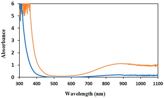 On the right part of the visible spectrum, recorded with our more concentrated solution (Figure 6), are two broad peaks, one at 866 nm and a second one at 930 nm. It was observed that there was an exchange of ligands from water to ethanol, as detailed in Figure S2. Two distorted octahedral Cu(II) complexes are observed and assigned to trans and cis complexes of Cu(II), containing two ethanol and four water molecules. These species correspond to an axially distorted octahedral field in the visible spectrum that gives an averaged maximum at 866 nm. There is also a broad absorption observed at 930 nm on the spectrum of the most concentrated solution (Figure 7 and Figure 8). Because of its position, this signal is attributed to Cu(I) species, possibly grafted on the graphene surface. They are stable in oxidation by oxygen molecules. Some protection by the solvent is necessary to explain their stability. Similar kinds of Cu species, grafted on C vacancies of carbon species on solid carbon diamonds, have been evidenced very recently []. They were investigated by demanding and expensive methods, EXAFS-XANES XANES [], but also by less expensive operando IR measurements []. Here, we selected to use UV–visible–NIR spectroscopy.