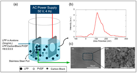 (a) Schematic representation of the AC−EPD setup employed for creating the LFP composite incorporating PVDF and carbon black. (b) Zeta potential distribution for the EPD suspension utilized in the deposition process. (c) SEM micrographs of the LFP electrode post-deposition, detailing the microstructural surface texture.