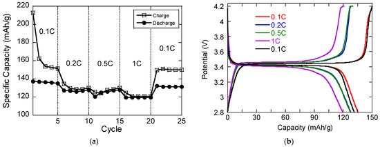(a) Graph illustrating the rate capability of LFP electrodes at discharge rates ranging from 0.1 C to 1 C. (b) Voltage discharge profiles at incremental C-rates.