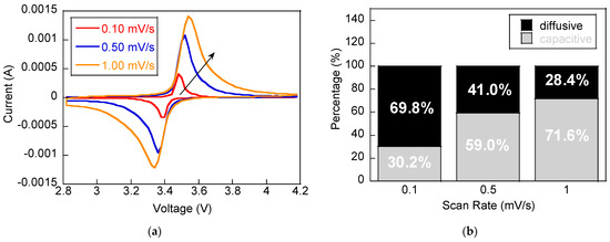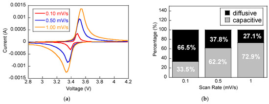 (a) CV traces of LFP after enduring 300 cycles at a 5 C discharge rate, obtained at scan rates of 0.1, 0.5, and 1 mV/s. (b) Post−cycling comparison of diffusive and capacitive charge contributions across different scan rates.