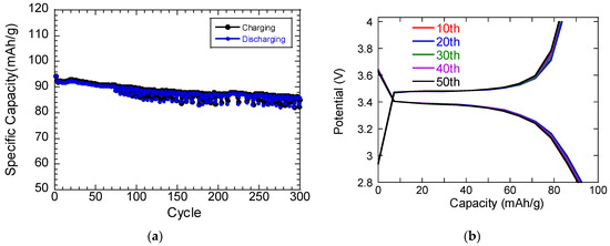 Lithium iron phosphate (LFP) is distinguished as a superior cathode material, celebrated for its extensive cycle life and a commendable theoretical capacity of approximately 170 mAh/g [7,8,9]. A hallmark of LFP is its stable discharge profile, characterized by a steady plateau around 3.4 V versus Li+/Li, which guarantees a consistent power output. Additionally, LFP outperforms many alternatives in thermal and chemical stability, enhancing battery safety and reliability [10]. The affordability and eco-friendliness of LFP are also significant; its minimal toxicity offers an environmentally friendly choice, particularly beneficial for the disposal and recycling of batteries.