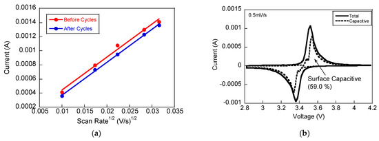 The change in the surface capacitive charge storage and Li-ion diffusion constant before and after cycling are compared in Figure 5. To quantify the Li-ion diffusion constant within the electrode, the Randles–Sevcik equation was employed, based on CV measurements across various scan rates: