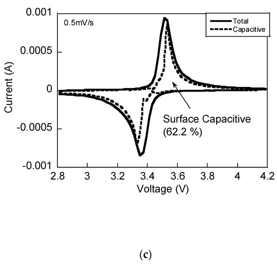 Here, Ip denotes the peak current (A), F is the Faraday constant, CLi represents the initial concentration of lithium ions (mol∙m−3), ν is the scan rate (V∙s−1), A signifies the electrode’s surface area (cm2), and DLi is the Li-ion diffusion constant (cm2∙s−1). The analysis revealed that the diffusion constant remained consistent at ~9.6 × 10−9 cm2∙s−1, both before and after cycling, as shown in the Ip vs ν1⁄2 plot of Figure 6a. This value, notably higher than typical diffusion constants for LFP electrodes made via slurry casting, highlights the effective Li-ion transport within the electrode, essential for achieving exceptional battery performance, especially at elevated charge and discharge rates. Comparison of the surface capacitive component in Figure 6b,c shows that the surface capacitive component increased by 3% after 300 cycles at 5 C. Observations indicate that the surface capacitive component’s contribution to the overall charge storage increased after cycling when compared to other LFP samples, for which data have not been presented.