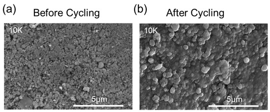 SEM images contrasting the LFP electrode surface morphology (a) before and (b) after a series of charge/discharge cycles.
