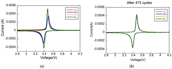 Indeed, as shown in the repeated CV measurements in Figure 8, after 500 cycles, the peak position and current of CV peaks were stabilized, with a lower current overall. The stabilization of peak positions in CV after extensive cycling suggests that the electrode has reached a state of electrochemical equilibrium. The changes in surface morphology, as observed in the SEM images of Figure 7, could lead to a new stable interface between the electrode and electrolyte, where the reaction kinetics for Li insertion and extraction become consistent and repeatable.