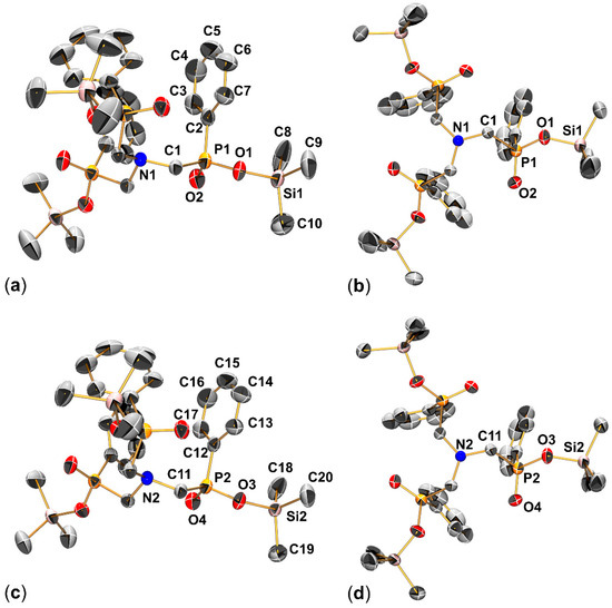 Compound NTPA(SiMe3)3 crystallized in the trigonal space group type R with two independent thirds of molecules in the asymmetric unit (Figure 2, Appendix A Table A1). Their N atoms are located on crystallographic 3-fold rotation axes (Figure 2b,d). The Si–O bond lengths (1.6756(14) and 1.6760(14) Å) are similar to those encountered with trimethylsilyl phosphate O=P(OSiMe3)3 (1.674(3) Å, [39]) and a derivative of a cyclic phosphinic acid, (Me3SiO)(O=)P[-C(SiMe3)2–CH2–CH=C(SiMe3)-] (1.672(2) Å, [40]). The latter was the only hit in a CSD search [41] for crystallographically characterized triorganosilyl derivatives of phosphinic acids. Thus, the crystal structure of NTPA(SiMe3)3 bears some novelty in this regard. Further metric data of these molecules (Table 1) will be discussed in the context of the further analysis of the acid NTPAH3.