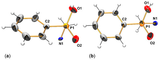 Thermal ellipsoid plots (50% probability) of the asymmetric units of NTPAH3 in its modifications NTPAH3P (a) and NTPAH3M (b), view along the P–CH2 bond.