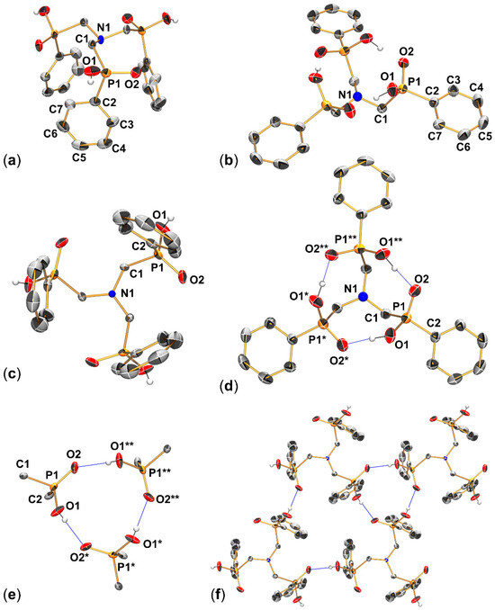 Molecular structures of NTPAH3 in its modifications NTPAH3P (in sections (a,c,e,f)) and NTPAH3M (in (b,d)) with thermal displacement ellipsoids at the 50% probability level (for clarity, C-bound hydrogen atoms are not depicted). Sections (a,b) show a selected view of each molecule with the atoms of the asymmetric unit labelled, (c,d) show the molecules viewed along the crystallographic c axis. Their nitrogen atoms (N1) are located on crystallographic 3-fold rotation axes, in both cases the whole molecules are generated by the symmetry operations (–y+1, x–y+1, z) and (−x+y, −x+1, z). For NTPAH3M these symmetry operations create a trimeric intramolecular hydrogen bond system (shown in (d), labels with * and ** indicate symmetry equivalents). In NTPAH3P intermolecular hydrogen bonds in a polymeric network (shown in (f)) give rise to a related (O=P–O–H)3 motif (magnified section of interest from (f) shown in (e), these symmetry equivalents * and ** are generated by symmetry operations –y+1, x–y, z and −x+y+1, −x+1, z, respectively).