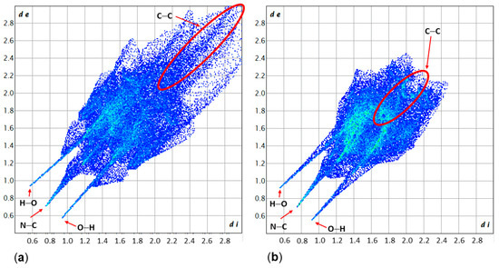 Fingerprint plots (de vs. di) of the Hirshfeld surface analyses (performed with CrystalExplorer version 21.5, revision 608bb32 [43]) of (a) the asymmetric unit of the crystal structure of NTPAH3P and (b) the asymmetric unit of the crystal structure of NTPAH3M. Note: The N–C interactions correspond to the N–C bonds, which connect the asymmetric unit with the two further symmetry equivalent parts of the molecule.