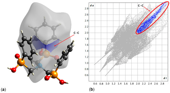 Selected section of the Hirshfeld surface analysis (performed with CrystalExplorer version 21.5, revision 608bb32 [43]) of the asymmetric unit of the crystal structure of NTPAH3P showing (a) the area of C–C interactions on the isosurface (dnorm) and (b) the corresponding section of the fingerprint plot (de vs. di).