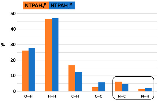 Percentage distribution (with respect to the area on the Hirshfeld surface) of the contacts of the asymmetric units of the crystal structures of NTPAH3P and NTPAH3M. Note: The N–C and N–H interactions (shown in the black box) correspond to the N–C bonds and interactions of N with their CH2 H atoms. Thus, they are intramolecular interactions in both cases.