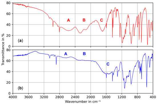 The IR spectra of NTPAH3P and NTPAH3M (Figure 8) are characteristic fingerprints, which clearly distinguish between the two modifications. The most prominent difference is associated with the OH groups of these compounds. As reported earlier [47], the vibrational modes of phosphinic acids´ OH groups in cyclic hydrogen bond situations may give rise to an “A-B-C”-pattern of broad bands of high intensity. These bands are located around 2560, 2200 and 1680 cm−1 for NTPAH3P and around 2630, 2190 and 1540 cm−1 for NTPAH3M. Notably, the “C” band is shifted to lower wavenumbers and gains in relative intensity over “A” and “B” bands for NTPAH3M. In the literature [47] it is interpreted as a sign of the increasing strength of the set of hydrogen bonds involved. Furthermore, a splitting of the “B” band is particularly obvious for NTPAH3P, and in the literature that splitting has been mentioned in the context of weaker H-bonds.