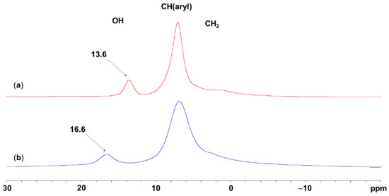 1H MAS NMR spectroscopy of these solids also supports the presence of stronger H-bonds in NTPAH3M. As shown in Figure 9, the signal of the OH protons (at δiso 13.6 ppm for NTPAH3P and at δiso 16.6 ppm for NTPAH3M) is sufficiently well resolved from the shift range of the aryl protons (the broad signal in the range 4–10 ppm) and thus clearly shows that the OH signal of NTPAH3M is shifted by Δδ ca. +3 ppm. It is well known that 1H NMR signals of protons in H-bond situations are shifted to higher frequencies and that this shift is more pronounced for nuclei in stronger H-bonds [48,49]. This has been underlined by correlations of decreasing OH groups’ 1H NMR shielding with shortening in O⋅⋅⋅O distances in series of carboxylic acids and phosphonic acids [48]. Moreover, this shift difference of the OH signal represents the greatest difference in the 1H MAS NMR spectra of these two compounds.