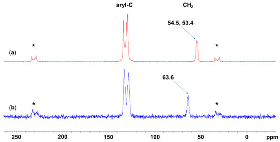 13C CP MAS NMR spectra of (a) NTPAH3P and (b) NTPAH3M recorded at MAS frequencies of 10 kHz. The asterisks (*) indicate spinning sidebands of the aryl-C signals.