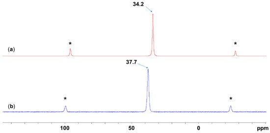 31P MAS NMR spectra of (a) NTPAH3P and (b) NTPAH3M recorded at MAS frequencies of 10 kHz. The asterisks (*) indicate spinning sidebands.