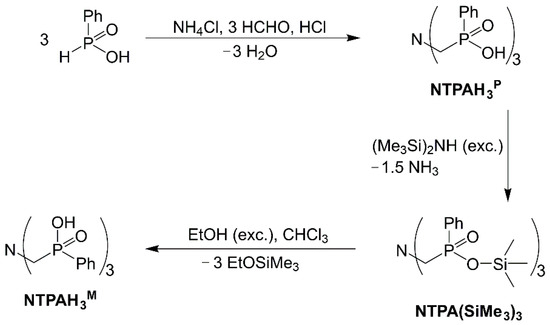 The nitrilotriphosphinic acid NTPAH3 in our study was prepared according to a previously published protocol [38] (Scheme 1), and the product obtained in this procedure (referred to as modification NTPAH3P; the superscript index P indicates its H-bonded polymeric nature in the solid state) was used for our study. Silylation of NTPAH3 in excess hexamethyldisilazane (which served both as the silylating reagent and as the solvent) afforded the tris(trimethylsilyl) derivative NTPA(SiMe3)3, which crystallized from the reaction solution upon cooling to room temperature. This compound is highly soluble in chloroform and, in this solution, highly sensitive toward protolysis (e.g., alcoholysis). Thus, deliberate alcoholysis of NTPA(SiMe3)3 in chloroform afforded long needles of NTPAH3 in a new modification (referred to as modification NTPAH3M, the superscript index M indicates its monomeric nature caused by exclusively intramolecular H-bonds).