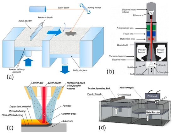 Schematic setups of AM techniques used in W materials fabrication: (a) SLM [92], (b) EBM [94], (c) laser-based DED [93], and (d) BJ [96].