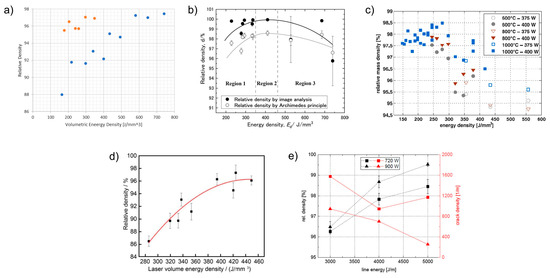 (a) The relative density of SLM-fabricated W cubes [36,108], (b) influence of VED on the density of pure W parts made with SLM [50], (c) influence of substrate preheating temperatures on the relative density of W samples [19], (d) relationship between VED and density in W-nickel alloy (W-15Ni) parts fabricated using DED [74], and (e) influence of LED and electron beam power on the relative density of W parts made with EBM [58]. Data and figures were reproduced with permission from Elsevier.
