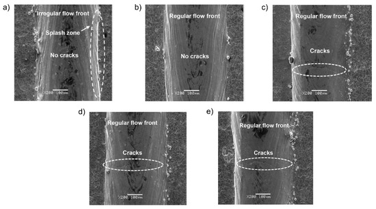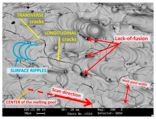 High energy inputs in AM processes that include SLM affect the molten pool due to the Marangoni effect. The severity of this effect is directly proportional to the laser energy input [38,111,112]. This effect can drag gas into the molten pool, leading to pore formation upon solidification. Excessive laser energy density, especially at lower scan speeds, can also result in molten pool instabilities, yielding a rough track [29]. As SEM images showing the typical surface morphologies of scanning tracks at different laser powers in the AM processing of W (Figure 4a–e [29]) indicate, an optimal laser power can result in a regular flow front and no cracking (Figure 4b).