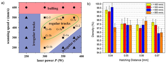 (a) Processing map for SLM of unalloyed W [17], and (b) the influence of hatch spacing and scanning speed on the relative density. The laser was maintained at a power of 170 W and the substrate was preheated to 80 °C [37]. Reproduced with permission from Elsevier.