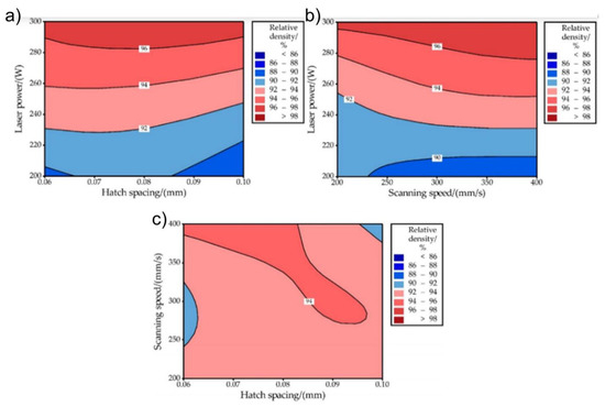 Processing map for SLM of W. (a) laser power vs. hatch spacing, (b) laser power vs. scanning speed, and (c) scanning speed vs. hatch spacing, [113].
