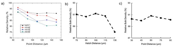 Influence on the relative density of manufactured W cubes due to the interaction between hatch spacing and point distance with input parameters of (a) a pulsed laser power of 400 W and exposure time of 100 µs [43], and (b,c) a laser power of 40 W, layer thickness of 50 µm, and exposure time of 300 µs [115]. Reproduced with permission from Elsevier.