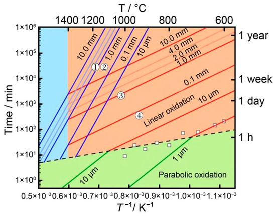W oxidation map in the temperature range of 600–1600 °C and up to 2 years. Contours indicate the thickness of the metal oxidized. The parabolic, linear, and sublimation regions are shaded in green, red, and blue respectively [122]. Reproduced with permission from Elsevier.