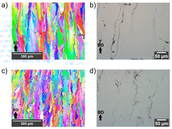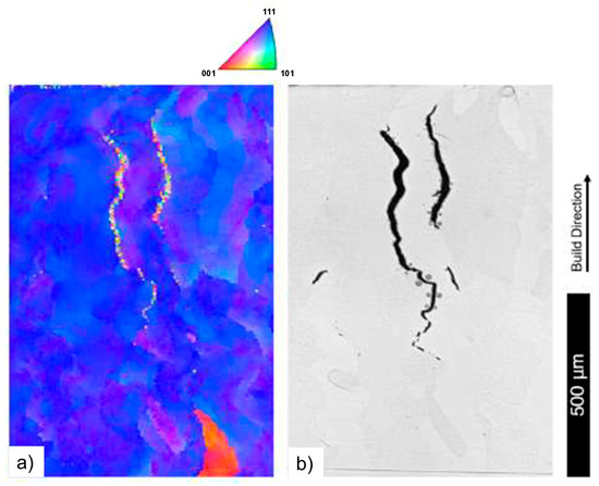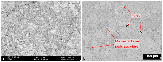 Crack nucleation and propagation in the AM of W correlate with its high DBTT of approximately 200–600 °C. Support for this comes from an observed delay between solidification and crack appearance using in situ high-speed cameras reported by Vrancken et al. [24,35]. Cracks often propagate along high-angle grain boundaries (HAGBs) [21], where the formation of cracks in the intergranular regions of SLM-fabricated W has been mostly observed. Such behavior is linked to W’s grain boundary sensitivity to impurities, notably oxygen, found in amounts between 30 and 370 ppm in W powder [24,38]. While some researchers attribute cracks to W oxide aggregation during solidification [21,37,41,42], persistent cracks at low oxygen levels indicate other possible influencing factors as well [24]. The role of impurities, including oxygen and hydrogen, in SLM on W brittleness has not been fully explored. High-speed in situ SLM videos show cracking across W’s DBTT, likely due to the increased stress [24]. Such stresses from SLM may only be offset by cracking at impurity-contaminated grain boundaries [42,125]. A study by Rebesan et al. on SLM-fabricated W specimens revealed a high cracking tendency [37]. Two types of cracks were identified: longitudinal (along the melt-pool center) and transverse (perpendicular to laser-induced surface ripples). Longitudinal cracks are linear and 30–100 µm long, while transverse cracks are shorter with an “S”-shape along grain boundaries (Figure 9). The extensive cracking results from thermal stresses during rapid solidification or recrystallization (Figure 10a), particularly below the DBTT. Micro-cracks that resemble intergranular hot cracking form due to nanopore aggregation at grain boundaries induced by boiling W oxides (WOx) in the melting pool (Figure 10b) [37].