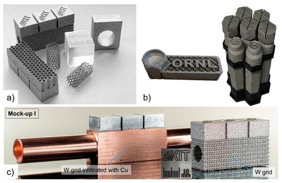 Conventional production methods for W-based alloys primarily rely on powder metallurgy techniques, which require high-temperature sintering. Achieving full densification is particularly challenging. Additionally, the hardness and brittleness of W alloys complicate formative and subtractive manufacturing processes, such as forming and machining methods. Furthermore, W oxidizes at relatively low temperatures (beginning around 400–500 °C), which increases the complexity and cost of manufacturing. Historically, the manufacturability of W-based alloys has been hindered by high costs, scalability issues, and challenges in producing intricate structures [11]. Additive manufacturing (AM) of refractory alloys offers unparalleled design freedom. Unlike traditional subtractive techniques that can waste up to 70% of material [12,13,14], AM’s layer-by-layer approach ensures material efficiency, especially with costly refractory alloys [15,16].