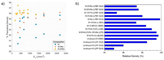 Recent findings by Sharma et al. [98] have demonstrated a maximum relative density of 99.2% for pure W, which is the highest value reported in the SLM of pure W. They employed a multi-scale thermo-kinetic and thermo-mechanical computational model to fine-tune the laser parameters and understand the thermal behavior during the melting and solidification phases. Their work demonstrates the potential for further density improvement through controlling laser power, scan speed, and hatch spacing.