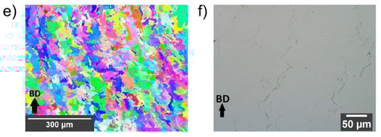 The work of Wang et al. on the laser-based DED processing of W found the relative density of fabricated parts increases with VED (Figure 3d) [74]. In their study on EBM processing of unalloyed W, Dorow-Gerspach et al. investigated the impact of LED variations by altering the power and speed of the electron beam to assess its effect on cubic samples [65]. These experiments were carried out at a substrate preheating temperature of 1000 °C. They achieved a high relative density of 99.5% but observed cracking in all fabricated cubes. While increasing electron beam energy led to a decrease in relative density, it also resulted in a decrease in crack density (Figure 3e), highlighting the trade-off between densification and structural integrity in this AM process [65].