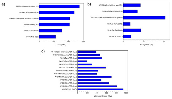 The remarkable properties of unalloyed W, including its exceptional melting point and high thermal conductivity, make it highly desirable in different applications. However, problems associated with the AM of W still need to be overcome. This section will briefly introduce key challenges and look at their potential solutions (Table 2). The mechanical properties of additive-manufactured unalloyed W, particularly its elongation, tensile strength, and fracture toughness, often fall short of expectations. Researchers have found ways to improve these properties through targeted alloying, the inclusion of ceramic reinforcements, and optimizing the parameters used during the AM process itself [49].