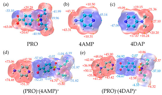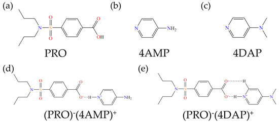 Chemical structures of (a) PRO, (b) 4AMP, (c) 4DAP, (d) (PRO)−(4AMP)+ and (e) (PRO)−(4DAP)+.