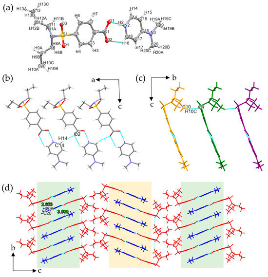 (PRO)−(4DAP)+ salt (1:1) The crystal structure of (PRO)−(4DAP)+ salt crystallizes in the monoclinic P21/c (Z = 4) space group, with one (PRO)− anion and one (4DAP)+ cation in the asymmetric unit (Figure 4a). There is overall disorder at the terminal propyl group of PRO, with PART1 accounting for 0.585 (6), and the crystal structure is resolved using the larger PART1 fraction. Proton transfer is detected from the carboxyl group of PRO to the pyridine N atom of 4DAP, leading to the formation of salt. The phenyl ring of the (PRO)− anion and the pyridine ring of the (4DAP)+ cation exhibit a slight tilt, with only a 5.26° rotation occurring between their planes (Figure S3), so (PRO)− anions and (4DAP)+ cations form a cyclic motif (7) through hydrogen bond C18-H18⋯O2 (2.356 Å; 129.74°) and charge assisted hydrogen bond N2+-H2⋯O1− (1.858 Å; 172.85°). Observed from the b-axis, the asymmetric units are connected by hydrogen bonds C14-H14⋯O2 (2.350 Å; 154.29°; −1 + x, y, z) to form 1D chains (Figure 4b). Then, observed from the a-axis, the 1D chains are connected by C10-H10C⋯O4 (2.573 Å; 154.49°; x, 1 + y, z) to form 2D planes (Figure 4c). The 2D planes are connected by C20-H20A⋯π (2.653 Å; 148.86°; 1 − x, 1 − y, 1 − z) and π⋯π (3.800 Å; 0.03(9)°; −x, 2 − y,1 − z) weak interactions to form 2D double-layer planes. The centroid–centroid distance within the π⋯π stacking amounts to 3.800 Å; the plane–plane distance is 3.448 Å; the angle between the normal of the plane and the centroid connection is 24.90°; the slippage is 1.597 Å. According to Christoph Janiak et al., the aforementioned π⋯π stacking represents a typical parallel-displaced π⋯π stacking of rings and encompasses the contribution of π⋯σ attraction [66]. Subsequently, the 2D double-layer planes are interconnected along the c-axis via weak interlayer interactions, thereby forming a complete 3D crystal structure (Figure 4d).