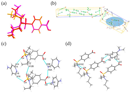 The molecular packing similarity of two salts was further evaluated using Mercury 4.2.0 software, taking into consideration various structural and ensemble factors. Comparison of the analysis of seven molecules revealed that only one molecule exhibited similar packing positions (Figure 5b). This suggests a poor similarity in crystal packing among them, possibly due to variances in the hydrogen bond networks of the two salts (Figure 5c–d).