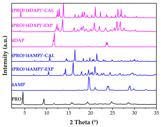 PXRD patterns of PRO, 4AMP, 4DAP, experimental and calculated (PRO)−(4AMP)+ and (PRO)−(4DAP)+.