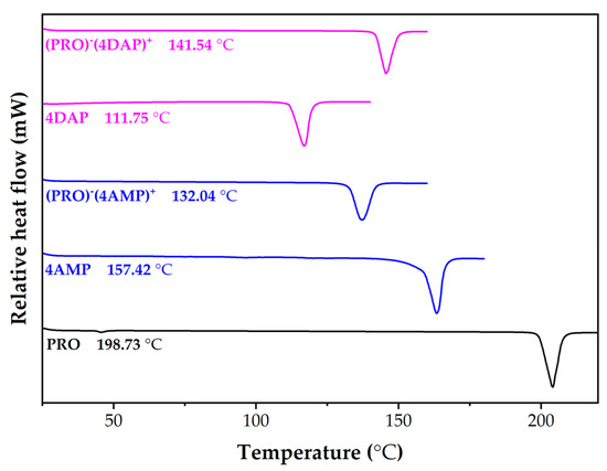 DSC curves of PRO, 4AMP, 4DAP, (PRO)−(4AMP)+ and (PRO)−(4DAP)+.