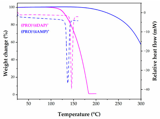 TGA-DSC curves of (PRO)−(4AMP)+ and (PRO)−(4DAP)+ (Solid lines represent the TGA curves, dashed lines represent the DSC curves).