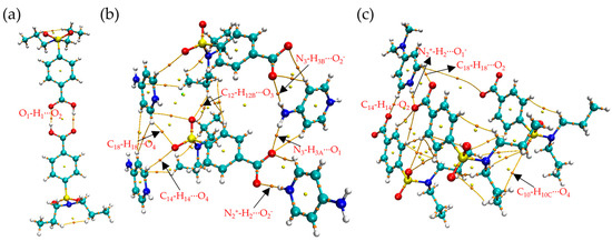 0.01 a.u. equivalent surface based on IGM Analysis, (a) PRO, (b) (PRO)−(4AMP)+ and (c) (PRO)−(4DAP)+ (Green represent van der Waals forces, blue represent hydrogen bonds).
