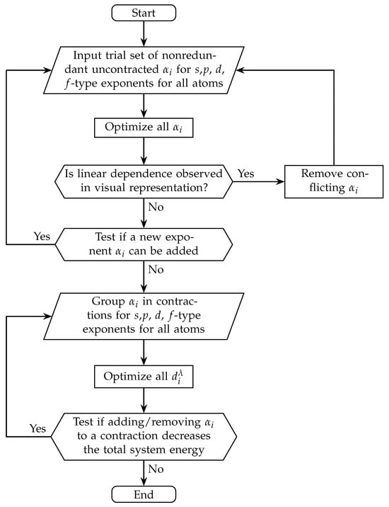For a different model system, the BS reoptimization is straightforward. First, the contractions are removed, and then all nonredundant exponents are reoptimized. Second, the contractions are created with new exponents. Finally, only contraction coefficients are reoptimized.