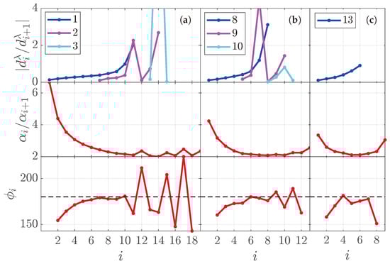 Visual representation for BS1 of Sr in for (a) s-type (), (b) p-type (), and (c) d-type () coefficients (Equation (12)). It consists of: modulus of consecutive contraction coefficients ratios (top), where shell index, , is provided in the legend, the ratio of successive nonredundant exponents, (middle), and angle, (bottom), between ratios (, ,) where the dashed line denotes . In the same way, the method of visual representation is used for BS1 of Ti and O (Supplementary Figure S1).