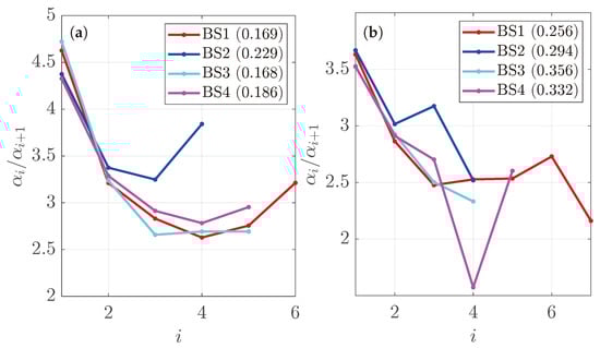 The visual representation of the ratio of successive exponents, for (a) O p-type and (b) Ti d-type BS coefficients for the comparison of four BSs: BS1 (present study), BS2 [], BS3 [], BS4 []. The smallest exponent value in of p- and d-types for each BS are given in the legends of (a,b), respectively.